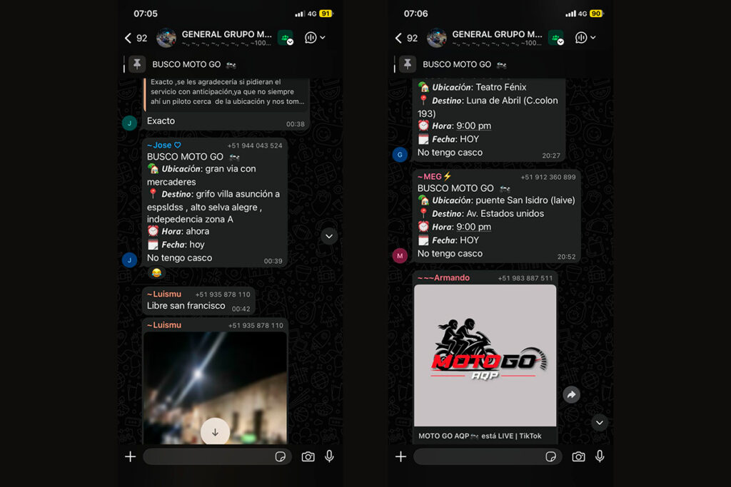 Mediante un grupo de WhatsApp, unen a cualquier persona sin necesidad de un filtro. Allí, el potencial usuario solicita una carrera con la siguiente estructura: “Busco Moto Go”, luego detalla su ubicación y el destino, además de la hora y la fecha en que requiere el servicio, finalmente confirma si tiene casco.