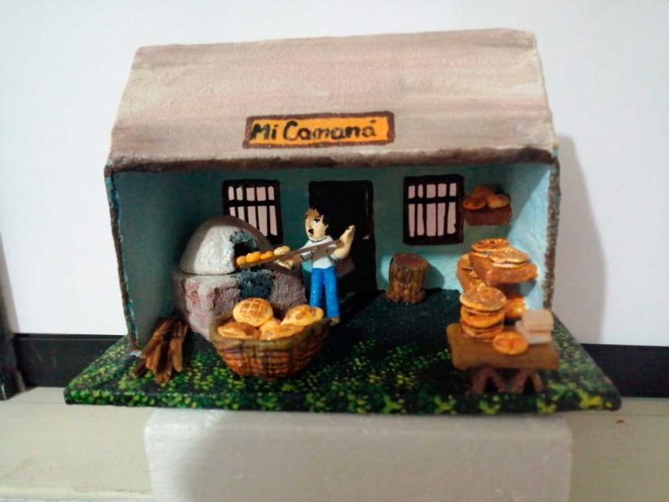 Las casitas están hechas de cajas de cartón (donde vienen artefactos eléctricos o zapatos), arena, cola sintética, brochetas y otros materiales. Podríamos decir que, su trabajo, contribuye con el medio ambiente pues reutiliza algunos materiales. “En ocasiones los amigos me avisan que tienen cartón y ahí mismo acudo a buscarlos, para ver qué puedo usar”, precisa.