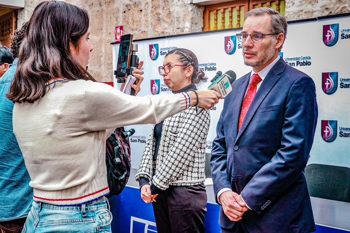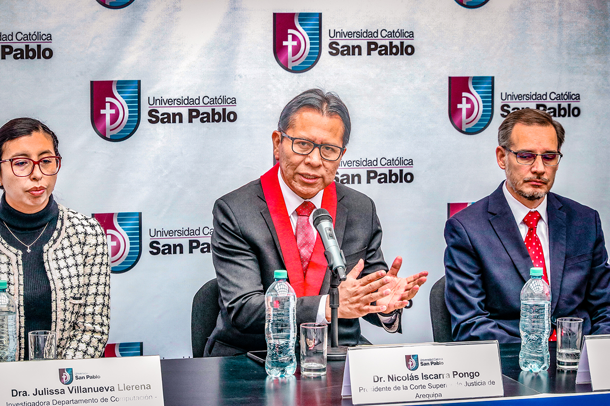 Para presentar este proyecto se realizó una conferencia de prensa que contó con la participación de los investigadores de la UCSP y de Nicolás Iscarra, presidente de la Corte Superior de Justicia de Arequipa, quien destacó el trabajo de la Universidad Católica San Pablo como un aporte valioso desde la academia para mejorar el servicio de justicia en el país.