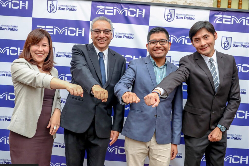 En la presentación de ZEMCH 2023, participaron los docentes y coordinadores generales del evento Carlos Zeballos y Denis Mayta, junto a Tatiana Medina (directora de la Escuela de Arquitectura) y Joel Arias (director de la Escuela de Ingeniería Ambiental). Todos ellos de la San Pablo.