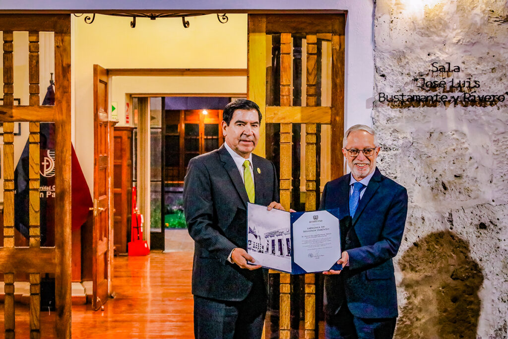 En una ceremonia realizada en el Centro de las Artes de la UCSP, la comuna bustamantina representada por su alcalde, Cnel. (r) Fredy Zegarra Black, otorgó los reconocimientos al rector de la San Pablo, Alonso Quintanilla Pérez-Wicht, a la directora del Centro de las Artes de la San Pablo, Fiorella Quintanilla y a la coordinadora de Artes Escénicas y Visuales del mismo centro, Vanessa Llerena.