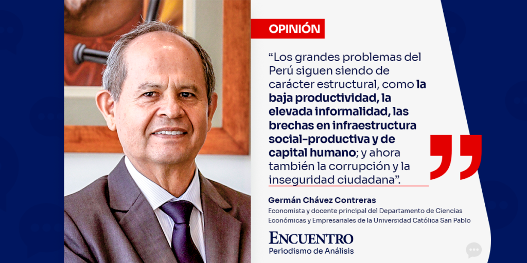 En realidad, los grandes problemas del Perú siguen siendo de carácter estructural, como la baja productividad, la elevada informalidad, las brechas en infraestructura social-productiva y de capital humano; y ahora también la corrupción y la inseguridad ciudadana. Estas deficiencias reducen nuestro PBI potencial y limitan el crecimiento de largo plazo a cifras por debajo del 4 %, que no nos alcanza para mejorar sustancialmente el empleo, reducir la pobreza y lograr un crecimiento que nos lleve al desarrollo integral, solidario y sostenido con aporte al bien común y a la construcción de una sociedad mejor.