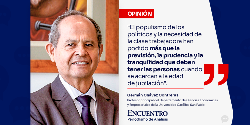 Durante los últimos meses se tomaron decisiones que complican la situación del sistema previsional de los trabajadores formales del país. El populismo de los políticos y la necesidad de la clase trabajadora han podido más que la previsión, la prudencia y la tranquilidad que deben tener las personas cuando se acercan a la edad de jubilación, que en Perú es a los 65 años (D.L. 19990 y edad por ley en el sistema privado de pensiones-AFP).