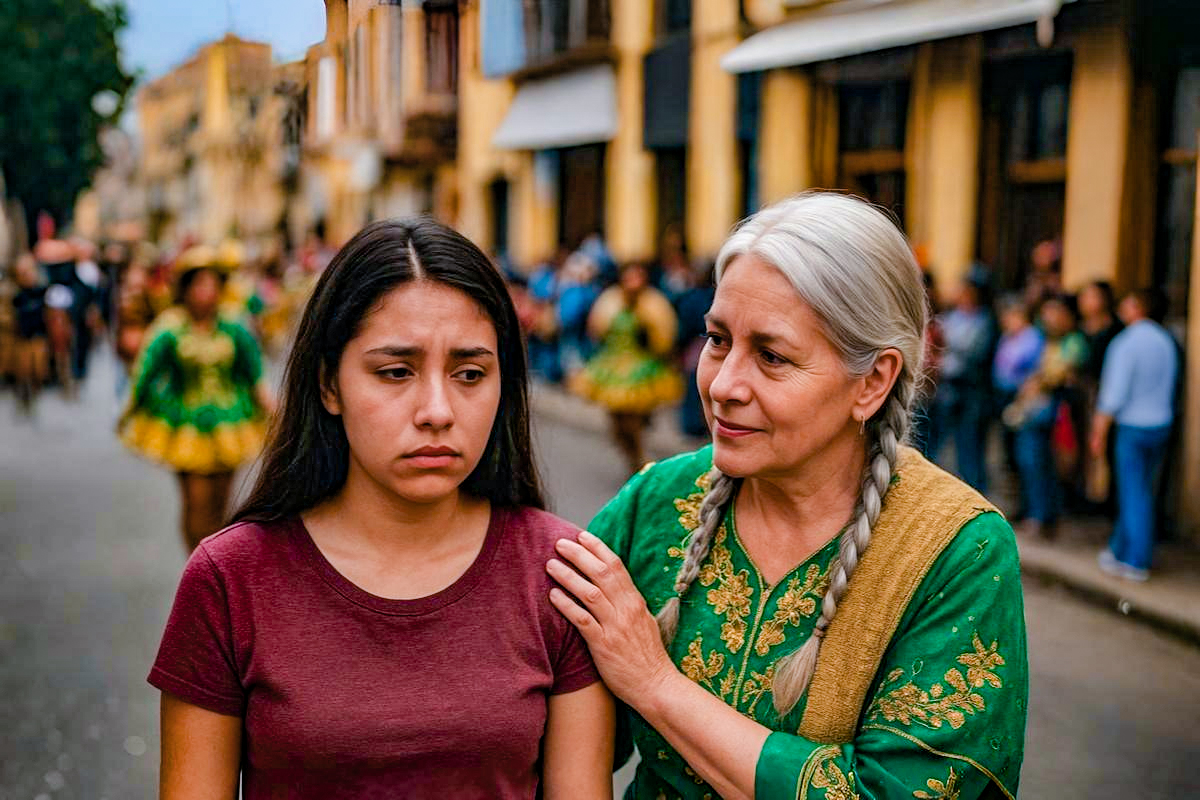 Entonces, la vi, vi a la desconocida de la otra noche, estaba bailando morenada. Pero esta vez se veía distinta: llevaba una pollera verde con apliques dorados, una blusa del mismo tono y una manta color vicuña. Su cabello platinado estaba recogido en dos trenzas perfectas, y sostenía su matraca en la mano con una sonrisa.