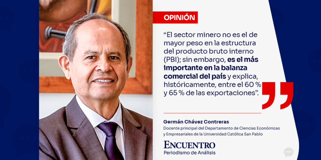 El sector minero no es el de mayor peso en la estructura del producto bruto interno (PBI) –con una proyección de 9.5 % para 2024, según la consultora EY-Perú–; sin embargo, es el más importante en la balanza comercial del país y explica, históricamente, entre el 60 % y 65 % de las exportaciones. Además, se ha convertido en el motor que impulsa nuestro comercio exterior y el crecimiento de la economía nacional.