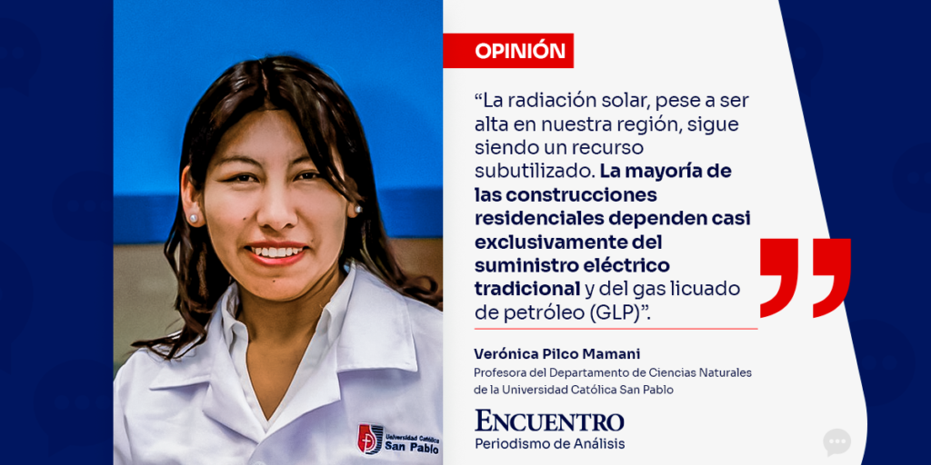 La irradiación solar promedio en Arequipa, de 6,5 kWh/m²/día con unas 2 370 horas efectivas anuales, permite generar hasta 2 250 kWh/kWp instalado, ideal para sistemas fotovoltaicos y térmicos domiciliarios. Aunque el potencial fotovoltaico posiciona a Arequipa como líder nacional, con proyectos solares en ejecución (Sunny, Illa, San José, Sol de Verano I) que aportarán más de 900 MW al Sistema Eléctrico Interconectado Nacional (SEIN) entre 2026 y 2028, su aplicación en viviendas sigue limitada por la dependencia del GLP y de la red tradicional.