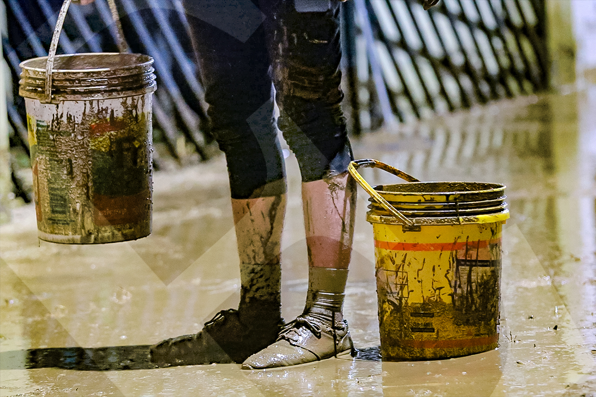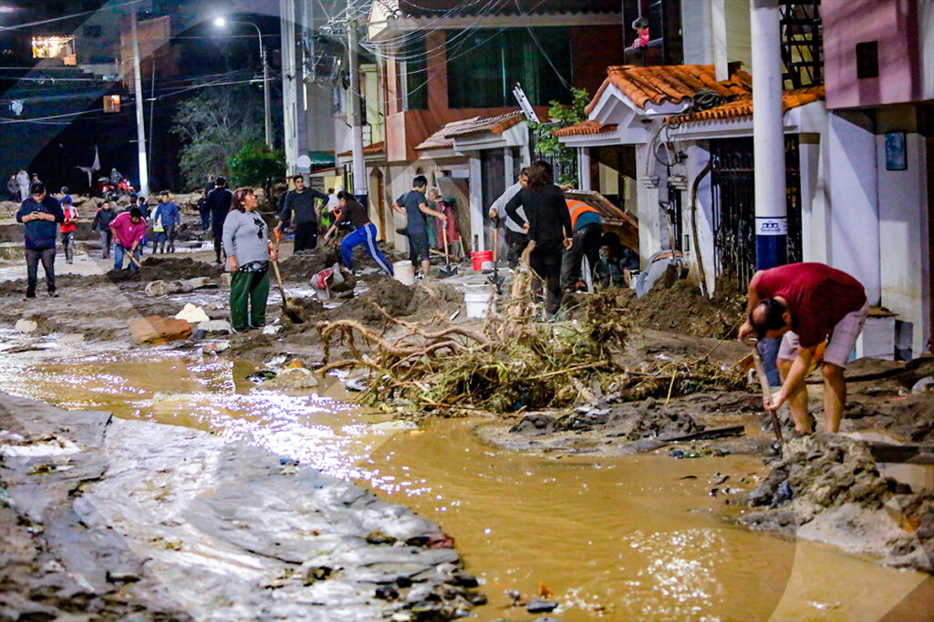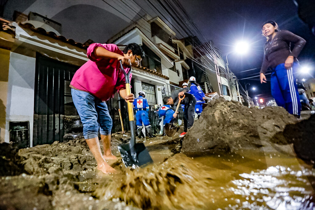 Con baldes, la gente retira el lodo que supera el metro de altura y cubre por completo las fachadas de sus casas.