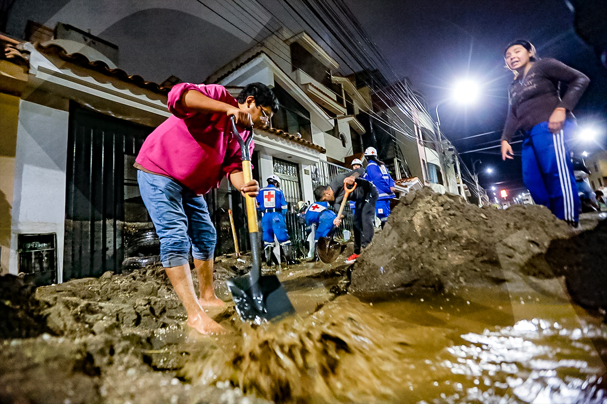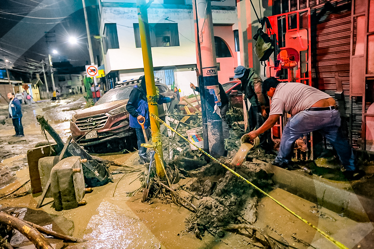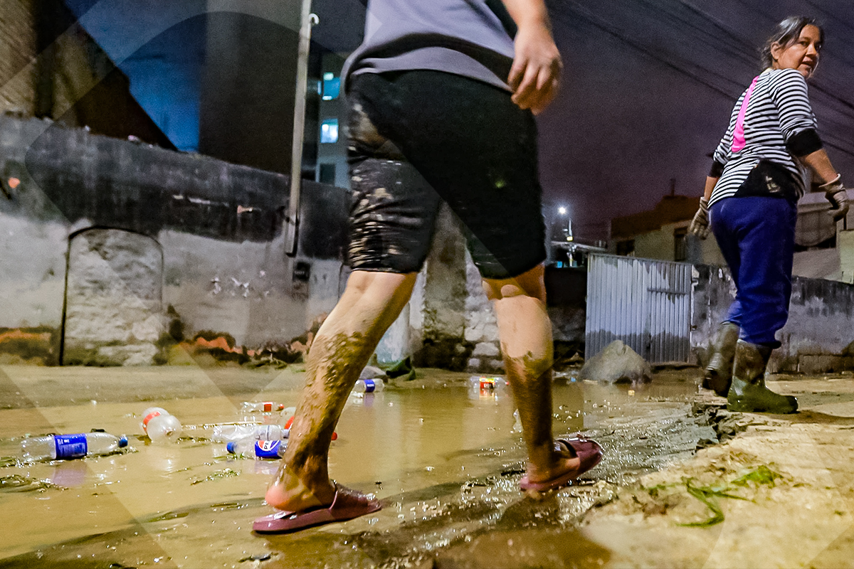 Cubiertos de barro, los damnificados esperan para limpiar los restos del huaico de sus casas.