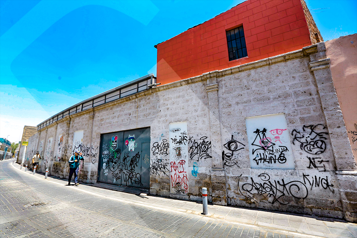 Este extenso muro de sillar, que forma parte de la quinta cuadra de la calle Sucre, en pleno corazón de la ciudad, también está lleno de grafitis.