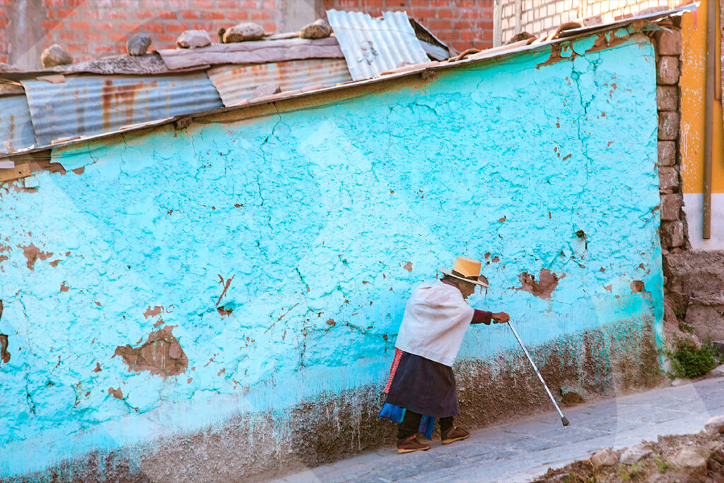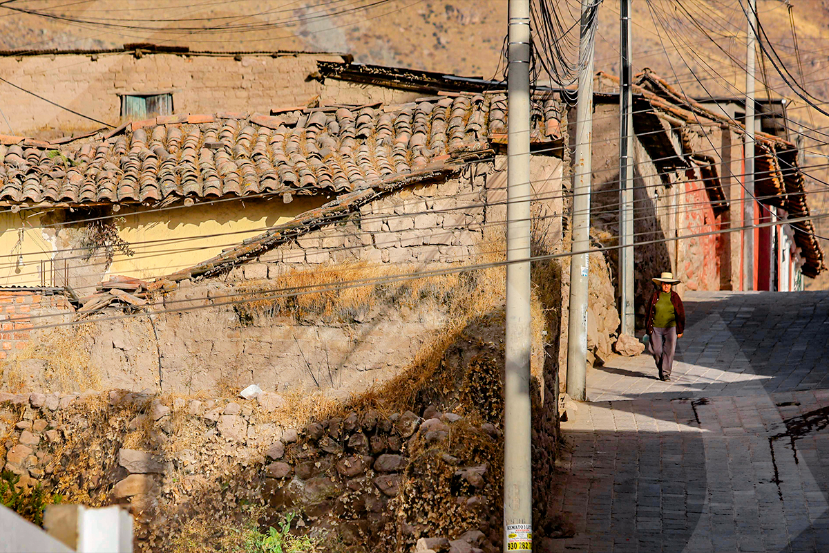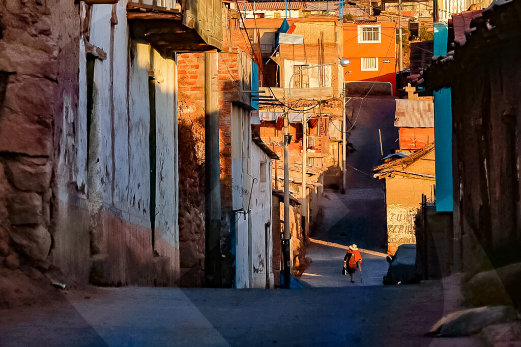 Con los primeros rayos del sol, una pobladora recorre una de las tranquilas calles de Chuquibamba. La paz del lugar resulta contagiosa.