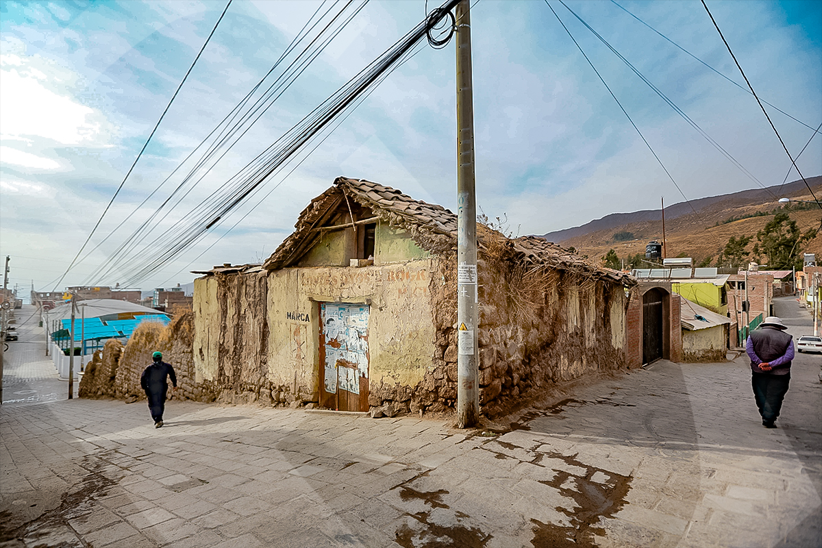 Dos lugareños caminan frente a una antigua casa que nos evoca la arquitectura que Chuquibamba tuvo en el pasado.
