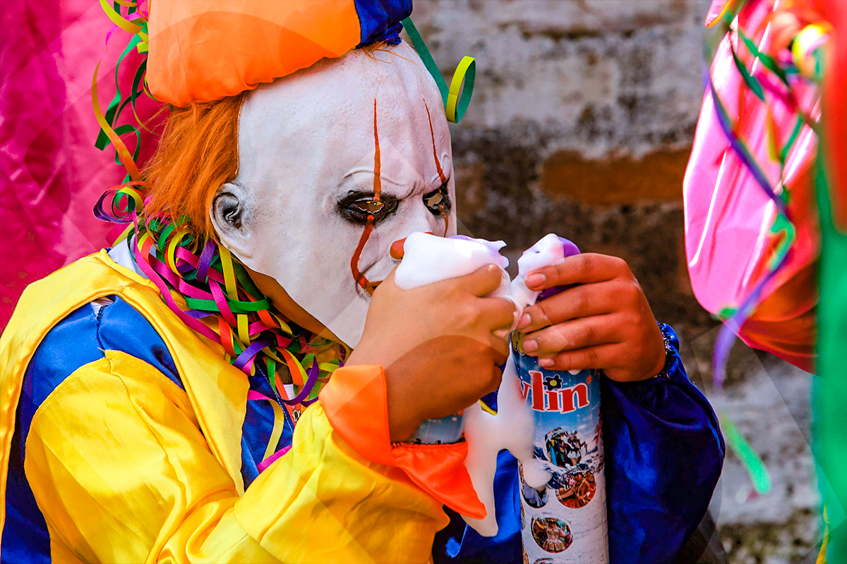 Un mojigango, con espuma en las manos, espera concentrado el inicio del carnaval, listo para sumarse.