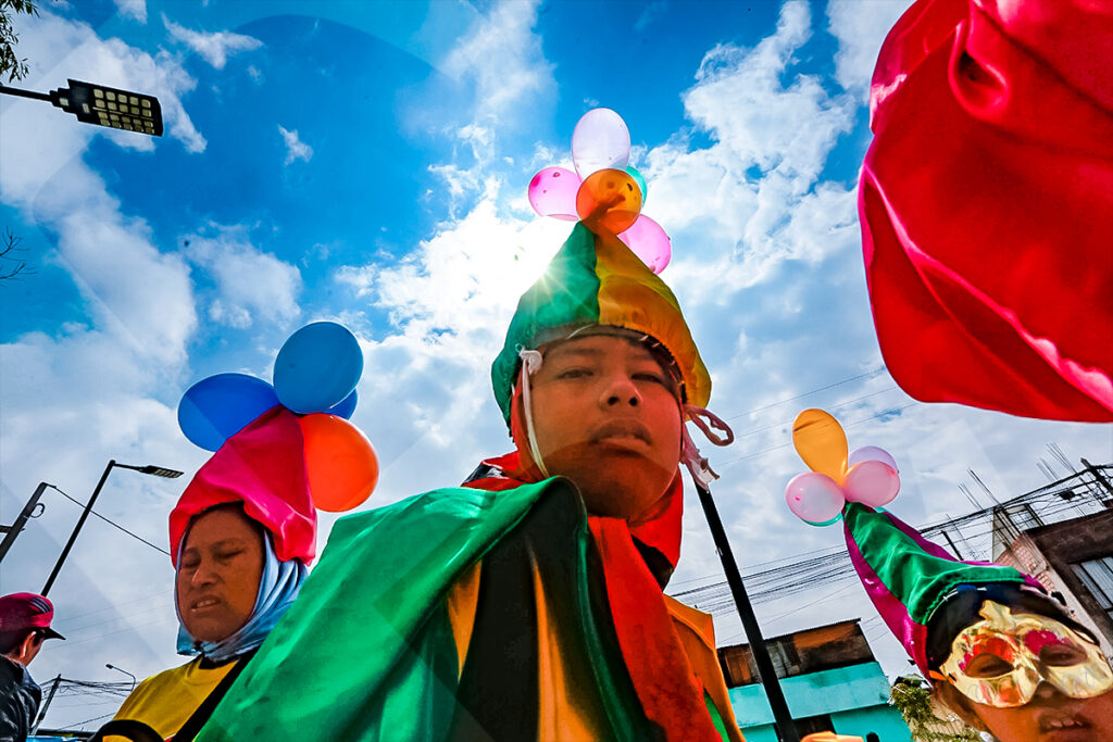 Los pocos rayos de sol que se asomaron, encendieron los colores del tradicional pasacalle en Cayma.