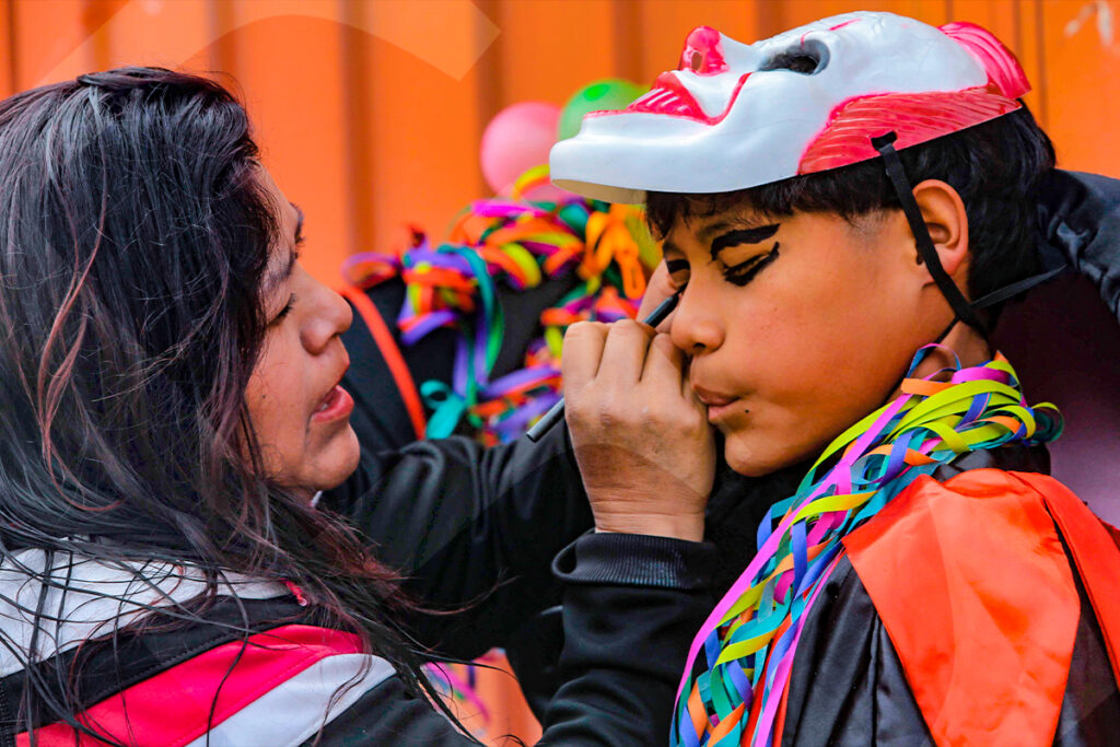 Una madre maquilla apresuradamente los ojos de su hijo, justo cuando la comparsa se pone en marcha.