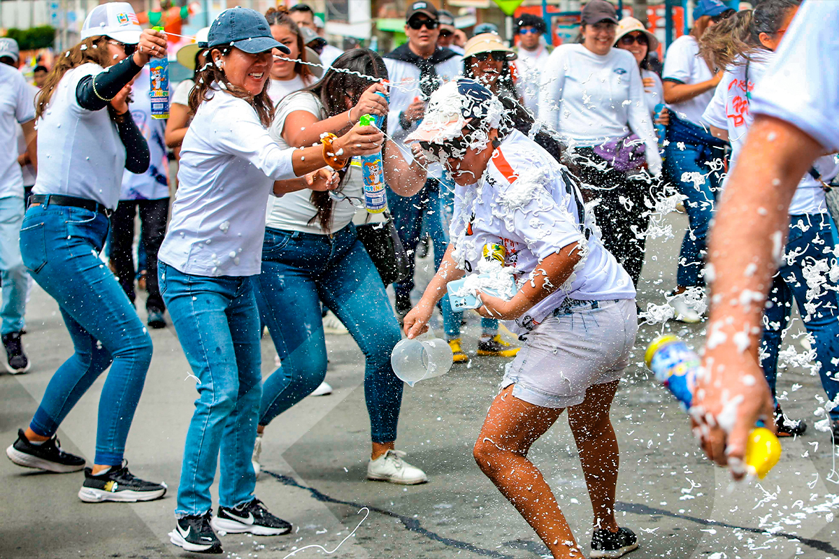 Personas de todas las edades se reunieron para jugar con espuma en el tradicional pasacalle, que inició en la plaza del sector de Buenos Aires.