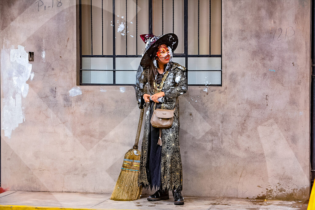 Una bruja con escoba espera a su agrupación, lista para unirse al desfile del carnaval.