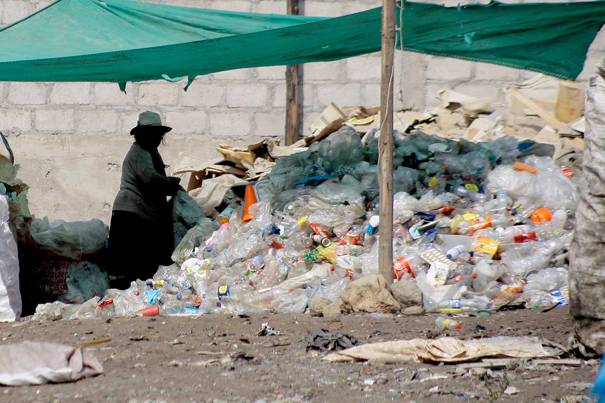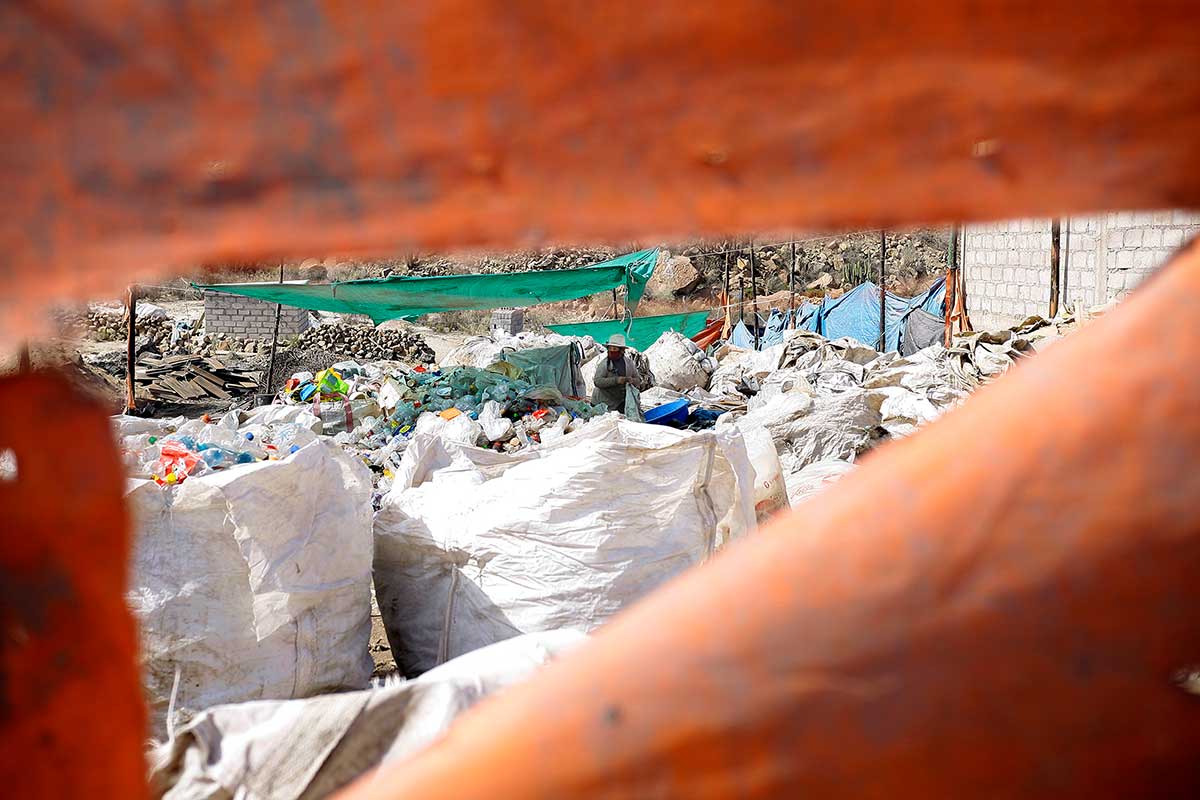 Bultos repletos de botellas de plástico, dividen los lotes donde los recicladores realizan sus labores de segregación.